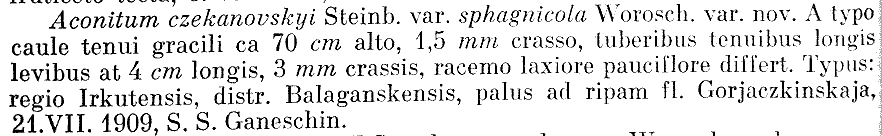 | Andriy Kovalchuk | Протолог Aconitum czekanovskyi var. sphagnicola Worosch. (Бюллетень Главного ботанического сада 64: 34. 1967):