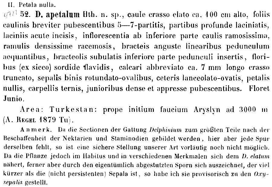 Протолог Delphinium apetalum Huth (Botanische Jahrbücher für Systematik, Pflanzengeschichte und Pflanzengeographie 20(3): 398. 1895 [9 Apr 1895]):