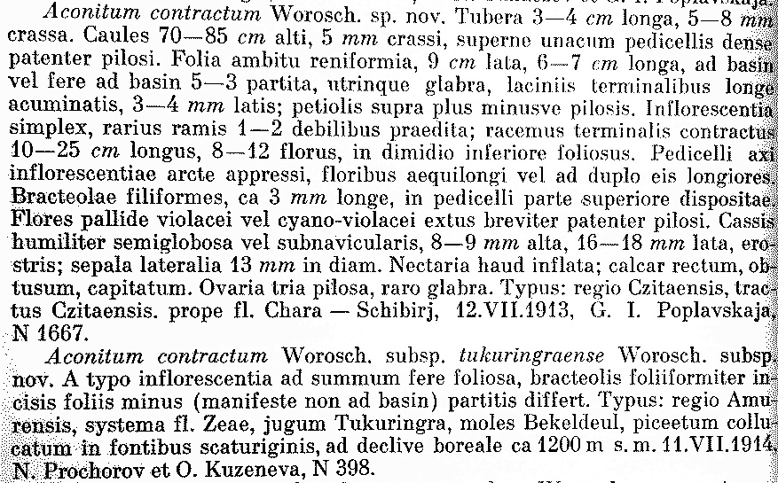 | Andriy Kovalchuk | Протологи Aconitum contractum Worosch. и Aconitum contractum ssp. tukuringraense Worosch. (Бюллетень Главного ботанического сада 64: 34. 1967):
