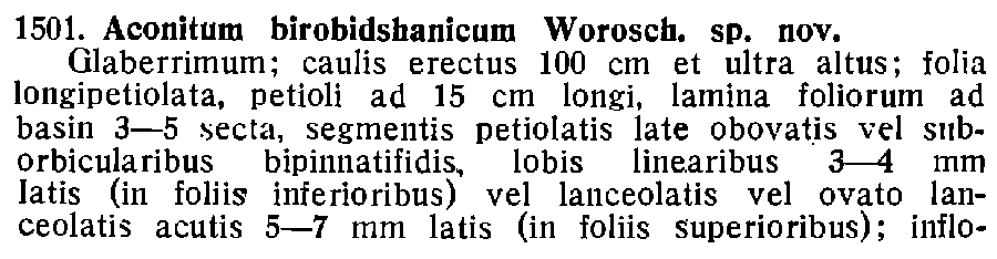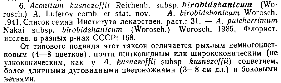 | Andriy Kovalchuk | Комбинация Aconitum tokii ssp. birobidshanicum (Worosch.) Worosch. у нас в базе сейчас подчинена записи A. tokii auct. Наверное, правильнее было бы завести отдельную запись Aconitum tokii Nakai и подчинить эту комбинацию ей. |