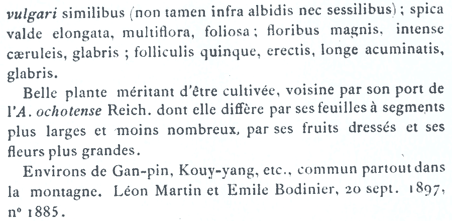 Протолог Aconitum bodinieri H. Lév. & Vaniot (Bulletin de l’Académie Internationale de Géographie Botanique sér. 3, 11(148): 45. 1902 [Mar 1902]):