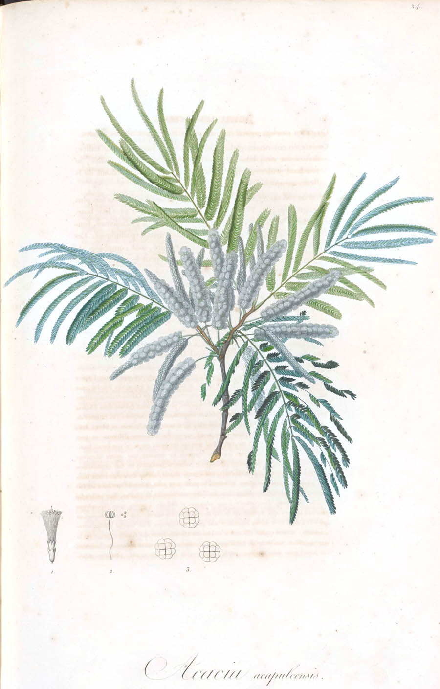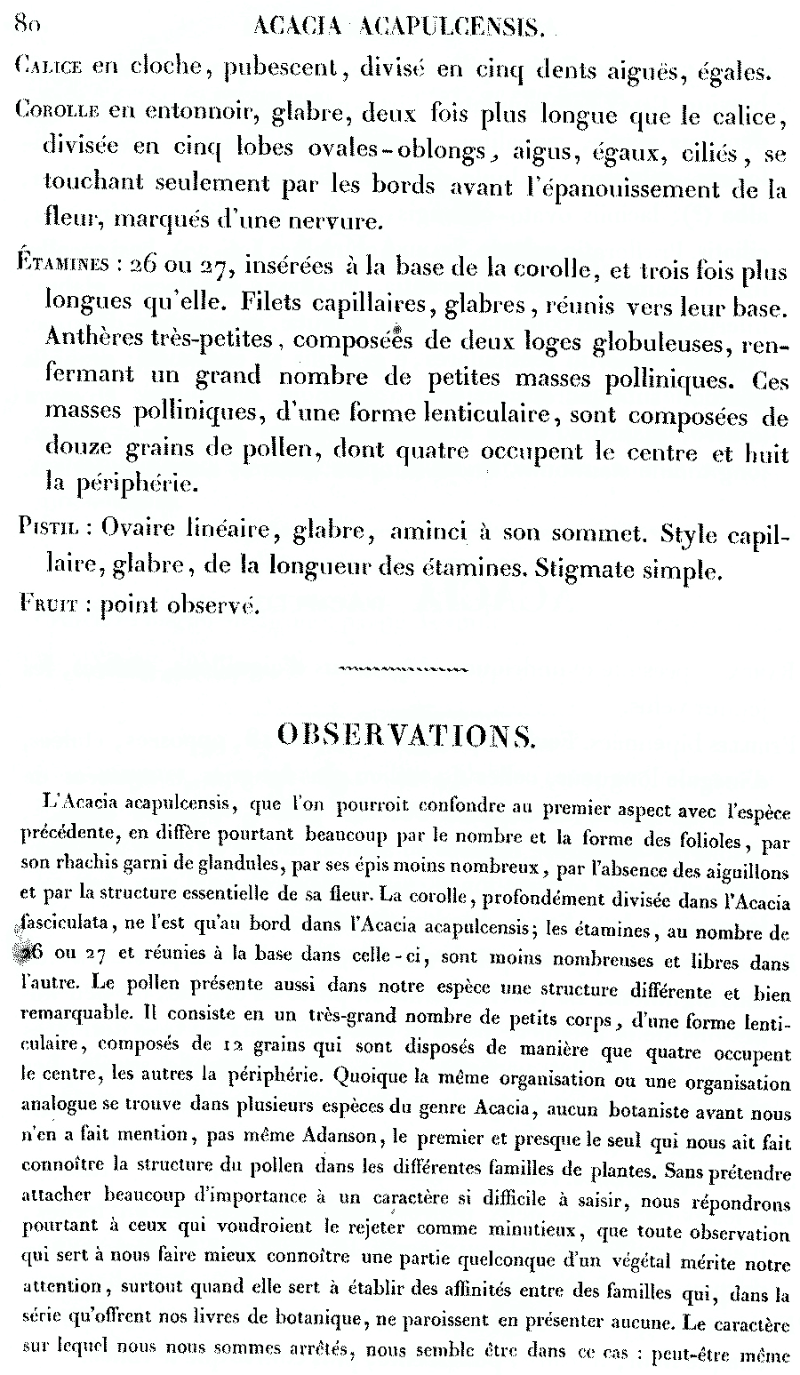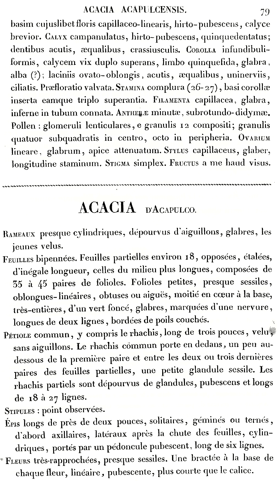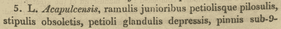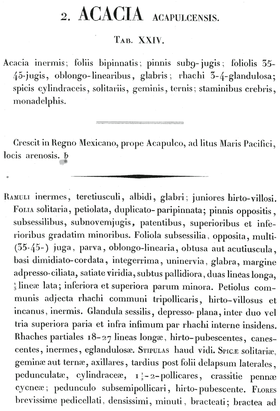 Протолог Acacia acapulcensis Kunth опубликован в работе "Mimoses et Autres Plantes Legimineuses du Noveau Continent, Recueilles par M. M. de Humboldt et Bonpland, Decrites et Publiees par Charles Sigismund Kunth": 78–81, pl. 24. 1821. (18 Jun 1821). К сожалению, найти его в сети мне не удалось. |