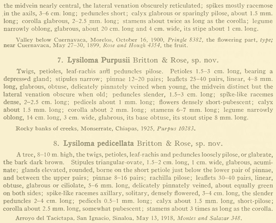 Первоописания Lysiloma cuernavacanum Britton & Rose, Lysiloma cuneatum Britton & Rose, Lysiloma durangense Britton & Rose, Lysiloma jorullense Britton & Rose, Lysiloma pedicellatum Britton & Rose, Lysiloma platycarpum Britton & Rose, Lysiloma purpusii Britton & Rose (North American Flora 23(2): 77-79. 1928 [25 Sep 1928]):