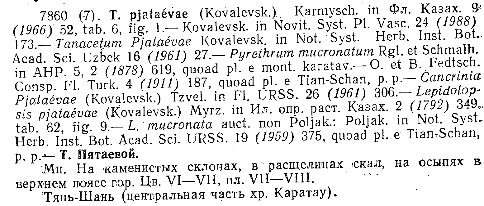 | Eugene Davkaev | В книге Байтенов М.С. "В мире редких растений" Алма-Ата: Кайнар, 1986. – 176 с. приводится описание Lepidolopsis pjataevae. В книге даны описания видов из КК Казахстана.