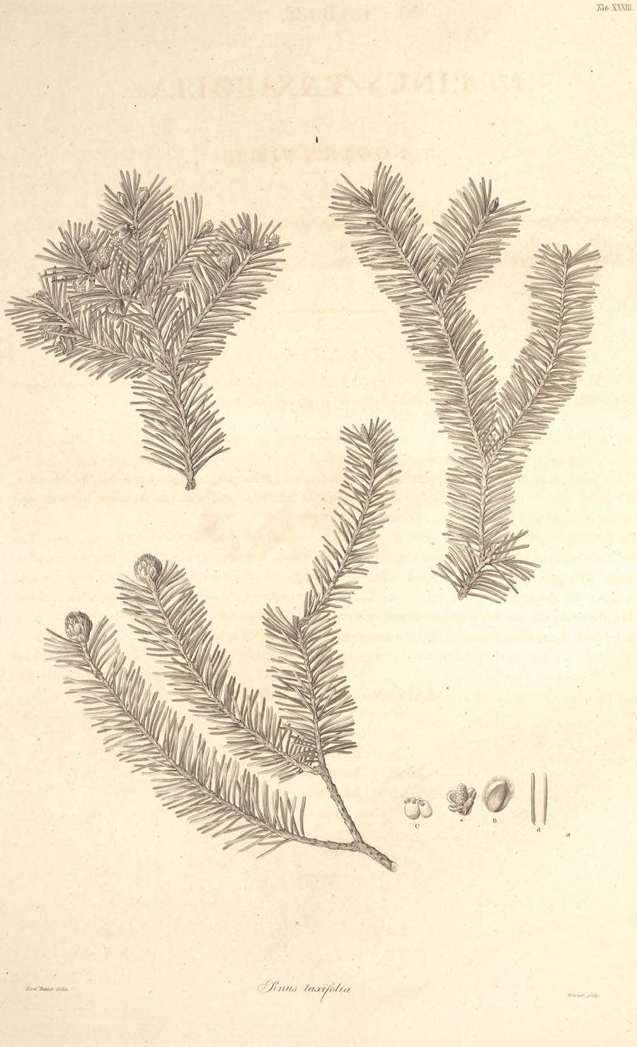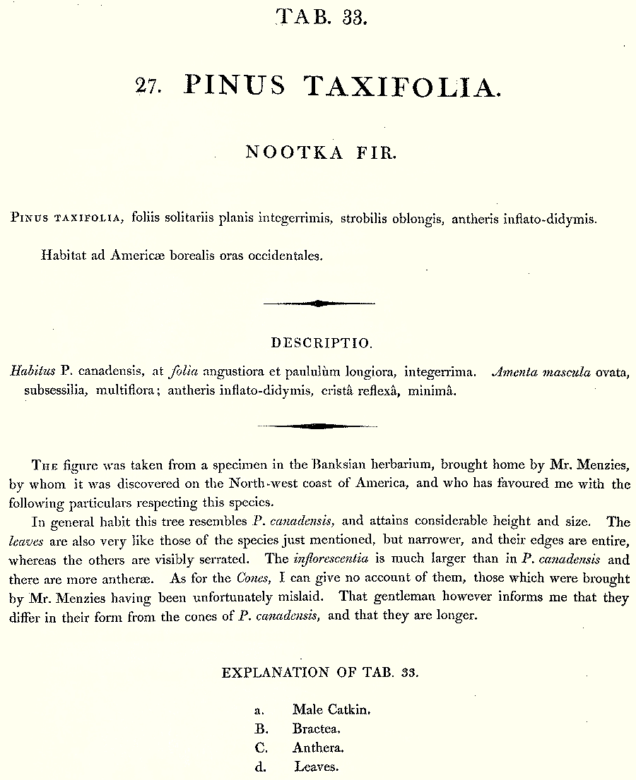 Протолог Pinus taxifolia Lamb. (Description of the genus Pinus: illustrated with figures, directions relative to the cultivation, and remarks on the uses of the several species 1: 51 (t. 33). 1803; nom. illeg., non Pinus taxifolia Salisb., 1796):