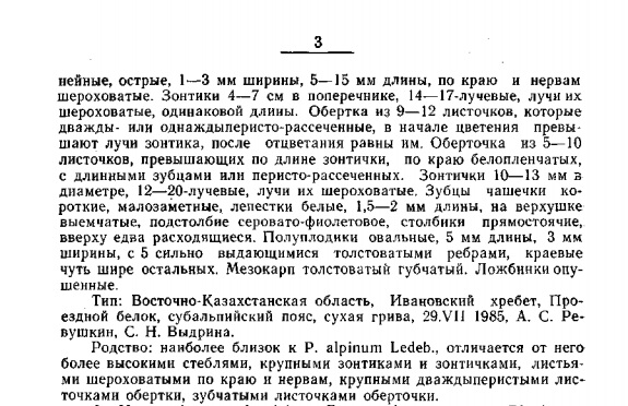 Pachypleurum alpinum Ledeb. 1829, Fl. Altaic. 1: 297.Лит.: Schischkin, 1950: 579; Korovin, 1963: 309; Pimenov, 1983: 267= Pachypleurum altaicumRevusch. 1990, Сист. Заметки Матер. Герб. Крылова Том. госуд. ун-та,29: 1, syn. nova. Вероятно тератная форма. Североазиатский горный (Ц+ИТ – рис. 46).