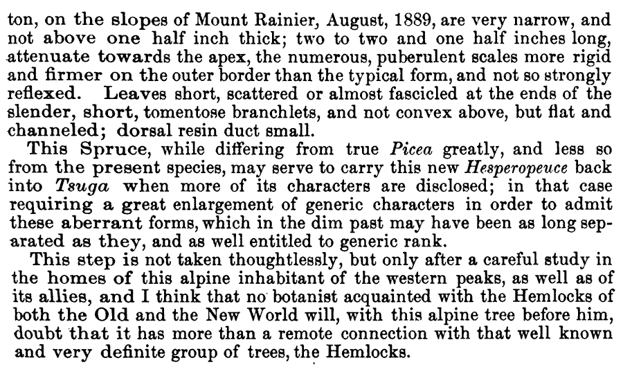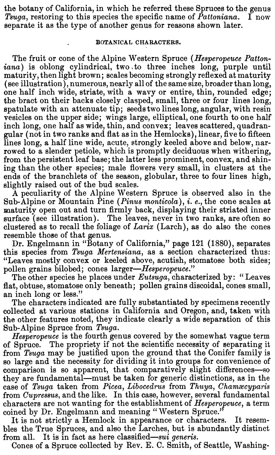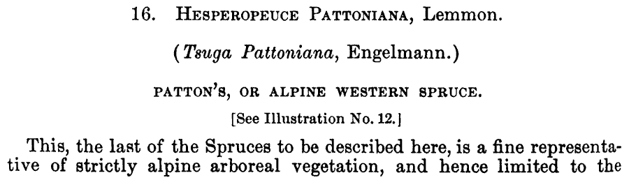 Протолог рода Hesperopeuce Lemmon (Third Biennial Report of the California State Board of Forestry for the Years 1889-1890 to Governor R. W. Waterman 126(-130), t. 9. 1890; тип: Hesperopeuce pattoniana (Jeffrey ex A. Murray) Lemmon (≡ Abies pattoniana Jeffrey ex A. MurrayBig smile image: