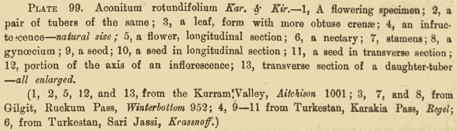 Иллюстрация из работы О. Стапфа (O. Stapf. The Aconites of India: A Monograph. Annals of the Royal Botaic Garden. Calcutta 10: Plate 99. 1905):