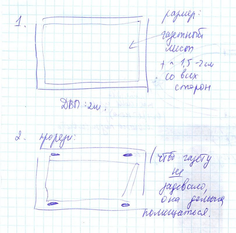 | Natalia Gamova | Можно так: берёте два куска какой-нибудь двп, размером чуть более того газетного листа, в который будете собрать, прорезаете в каждом 4 прорези и продеваете стропу (три метра хватит), завязываете- и всё готово.