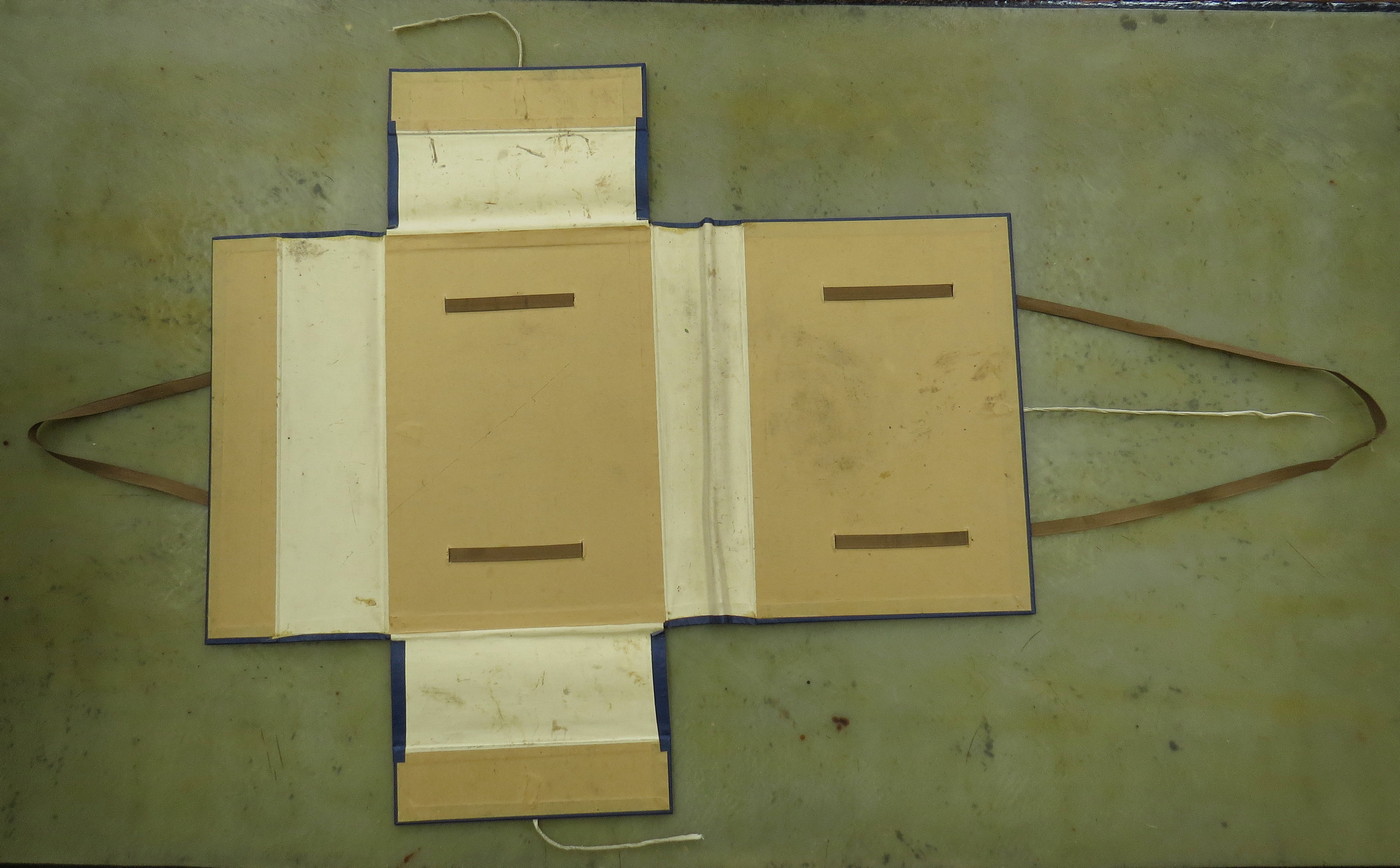 Там не то что обивка может быть - вот старые папки - они, в общем, скорее из какого-то картона - не рифлёного, а плотного - но не особо толстого - и обклеены снаружи тканью (кажется, даже просто х/б) - то есть если положить заготовку наружной стороной на ткань, подогнуть - и изнутри тоже заклеить - закрыть, чтоб и подгибку тоже - только уже бумагой. Мы пытались понять, чем клеено - кажется, всё-таки ПВА..