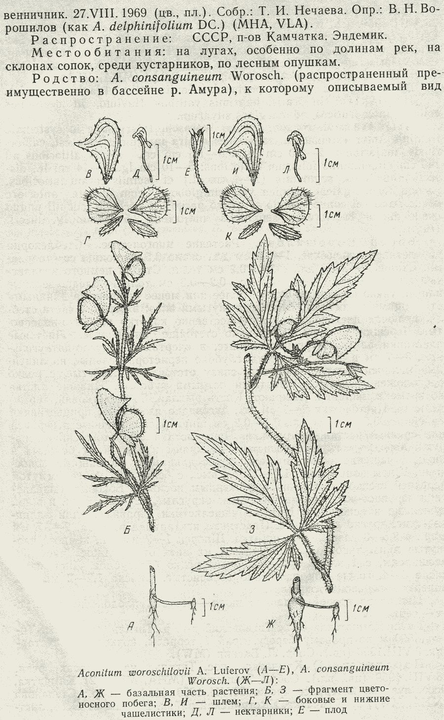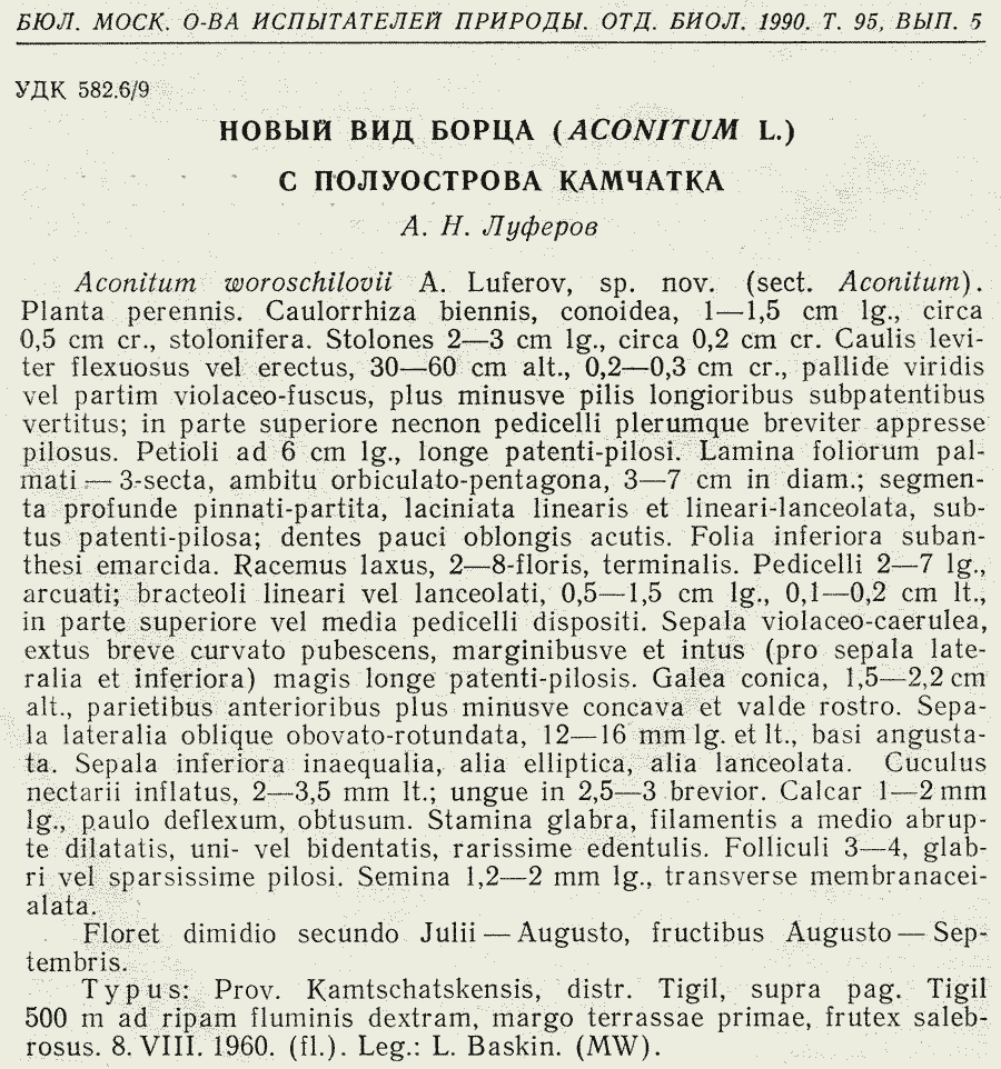 Протолог Aconitum woroschilovii Luferov (Бюллетень Московского общества испытателкй природы. Отдел биологический 95(5): 132(-135). 1990):