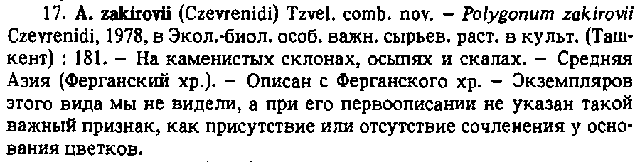 | Andriy Kovalchuk | Обнародование комбинации Aconogonon zakirovii (Czevr.) Tzvelev (Новости систематики высших растений 29: 62. 1993):