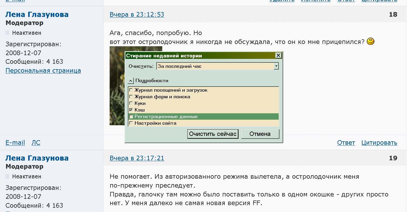 | Dmitry Oreshkin | Наталия, это совершенно точно "глюк" браузера. Попробуйте удалить профиль пользователя и переустановить FireFox - вот инструкции. |