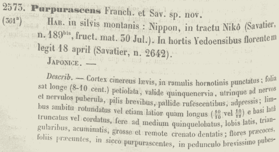 | Andriy Kovalchuk | Протолог Acer purpurascens Franch. & Sav. (Enumeratio Plantarum in Japonia Sponte Crescentium 2: 320(-321). 1878):