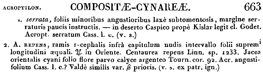 | Andriy Kovalchuk | Протолог Acroptilon angustifolium Cass., Acroptilon obtusifolium Cass., Acroptilon serratum Cass. и Acroptilon subdentatum Cass. (Dictionnaire des Sciences Naturelles 50: 465-466. 1827 [Nov 1827]):