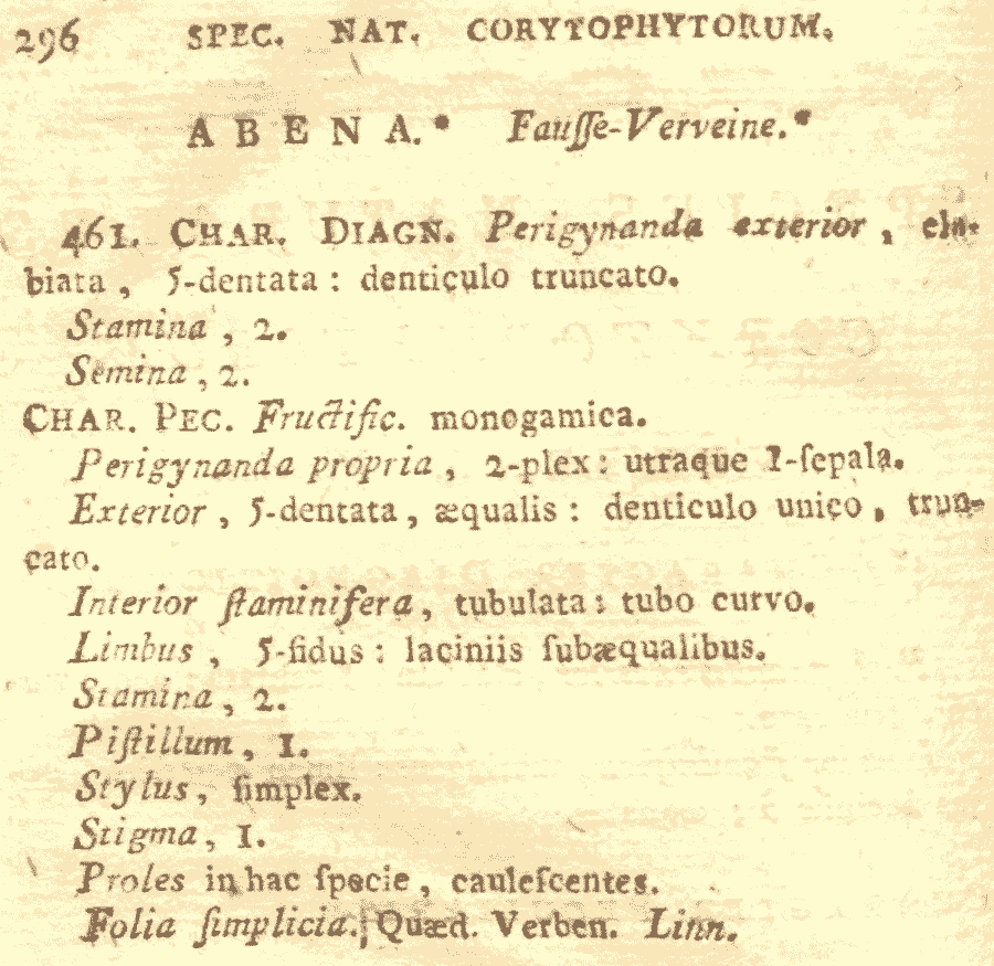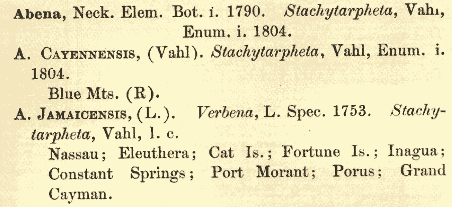 Обнародование родового названия Abena (Schauer) Neck. ex Hitchc. ( nom. illeg., nom. superfl. for Stachytarpheta Vahl 1804 ( nom. cons.)) (Report (Annual) of the Missouri Botanical Garden 4: 117. 1893):