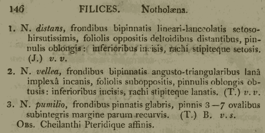 | Andriy Kovalchuk | Протолог рода Notholaena R.Br. (Prodromus Florae Novae Hollandiae et Insulae van-Diemen 145(-146). 1810 [27 Mar 1810]; lectotype (designated by J. Smith in Historia Filicum: 278. 1875): Notholaena trichomanoides (L.) Desv. (≡ Pteris trichomanoides L.):