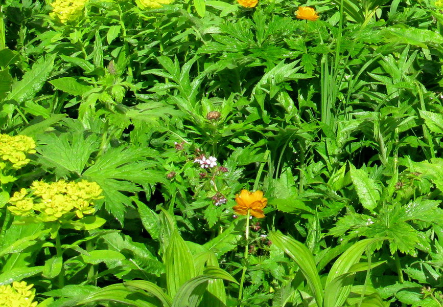 1. Вот купальницево-чемерицевый субальпийский луг. Чемерица Лобеля - размеры понятны. Купальницы по высоте около 1 м. И это в начале цветения! Опытный геоботаник поймет размеры. И этих купальниц - тысячи - и все однотипные.