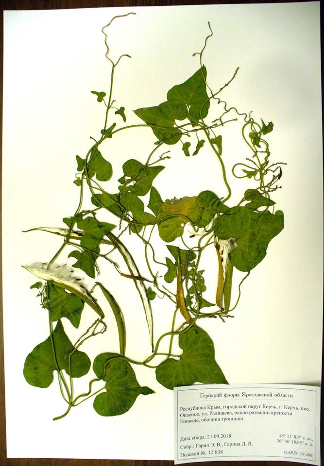 Собрали этой осенью в Керчи растение, напоминающее по местообитаниям наш полевой вьюнок - сорные места, вьющееся по кустарникам и тростнику. Цветов не видел, а плоды в виде стручков.