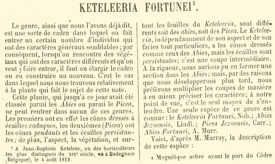 Род назван в честь бельгийского садовода Жана-Баптиста Кетелеера (Keteleer, Jean Baptiste (1813-1903