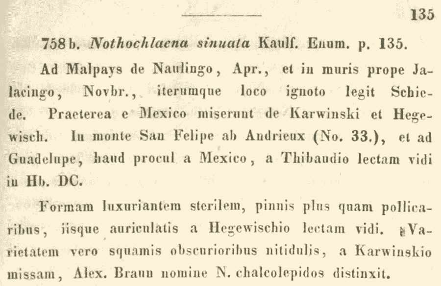 Протолог Notholaena chalcolepis A. Braun ex Kunze (Linnaea 13: 135. 1839. [Sept-Oct 1839]):