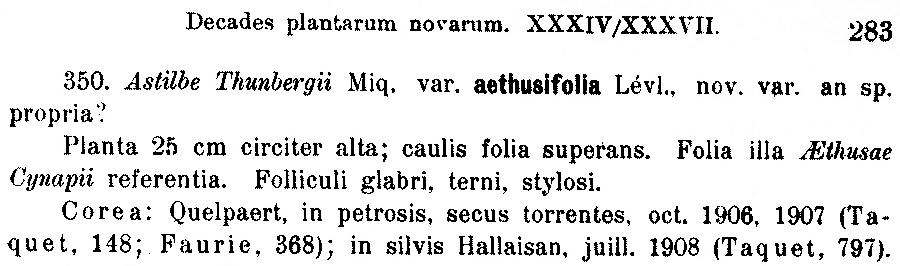 Протолог Astilbe thunbergii var. aethusifolia H.Lév. (Repertorium Specierum Novarum Regni Vegetabilis 8: 283. 1910):