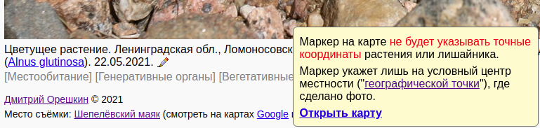 | Pavel Yevseyenkov | А что если вот здесь, при нажатии на "Google" и "Яндекса" будет всплывать диалоговое окно с примерно таким текстом: "Здесь указано положение местности, в которой сделано фото. Данные координаты НЕ ЯВЛЯЮТСЯ координатами растения на фото!" ?