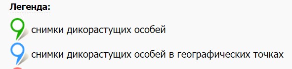 По-поводу самой карты, а точнее принятых обозначений. Синий маркер по факту указывает на местоположение географической точки, но подписан он "снимки дикорастущих особей в географических точках". Для не посвящённых совершенно не понятна разница между "снимки дикорастущих особей" и "снимки дикорастущих особей в геоточках". А разница огромна: в первом случае координаты особи указаны, во втором нет. Я думаю, что синий маркер надо подписать по принципу от общего к частному: во-первых это геоточка (сущность весьма специфическая), а во-вторых в ней были сделаны снимки особей таксона, страницу которого вы просматриваете. Ну, что-то типа: "географические точки со снимками дикорастущих особей". Аналогично и с культивируемыми. |