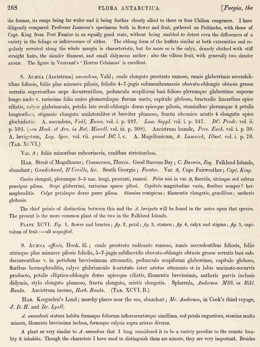 Протолог Acaena affinis Hook. f., Acaena cadilla Hook. f. и Acaena macrostemon Hook. f. (Botany of the Antarctic Voyage ...Volume 1. Flora Antarctica 1(2): 268-269, t. 96. 1846 [ante 2 Feb 1846]):