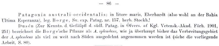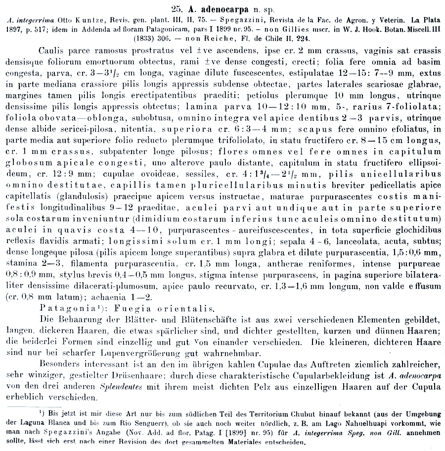 | Andriy Kovalchuk | Протолог Acaena adenocarpa Bitter (Bibliotheca Botanica 17, Heft 74: 86. 1910), Acaena adenocarpa var. basiinermis Bitter, Acaena adenocarpa var. microphylla Bitter и Acaena adenocarpa var. undiquearmata Bitter (Bibliotheca Botanica 17, Heft 74: 87. 1910):