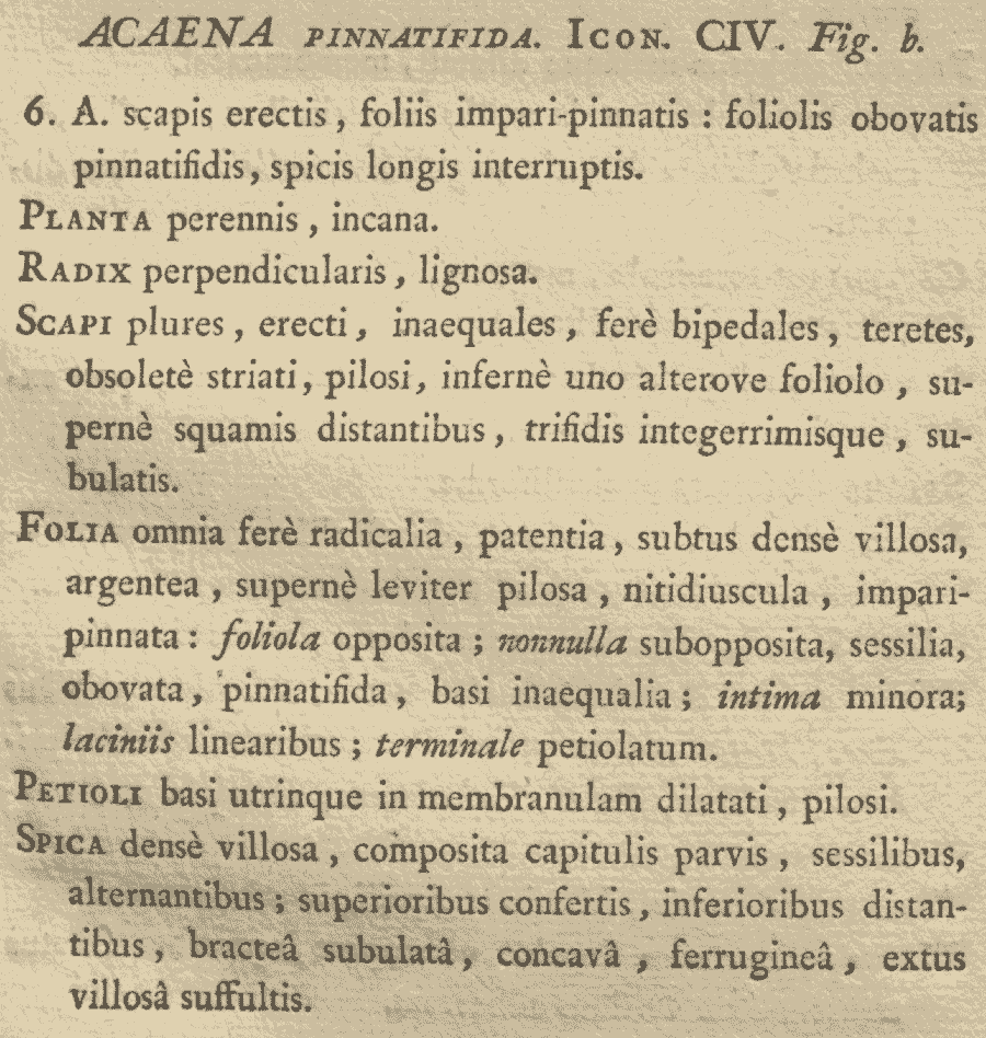 Протолог Acaena pinnatifida Ruiz & Pav. (Flora Peruviana, et Chilensis [Ruiz & Pavon] 1: 68, t. 104, f. b. 1798):