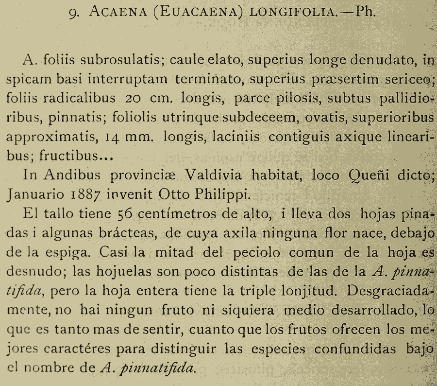 Протолог Acaena longifolia Phil. (Anales de la Universidad de Chile 84: 624. 1893):