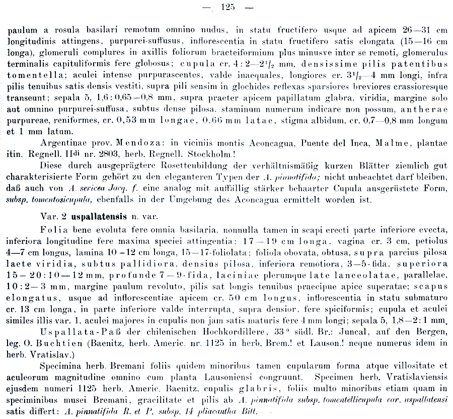 | Andriy Kovalchuk | Протолог Acaena pinnatifida ssp. tomentellicupula var. aconcaguensis Bitter (Bibliotheca Botanica 17, Heft 74: 124. 1910) и Acaena pinnatifida ssp. tomentellicupula var. uspallatensis Bitter (Bibliotheca Botanica 17, Heft 74: 125. 1910):
