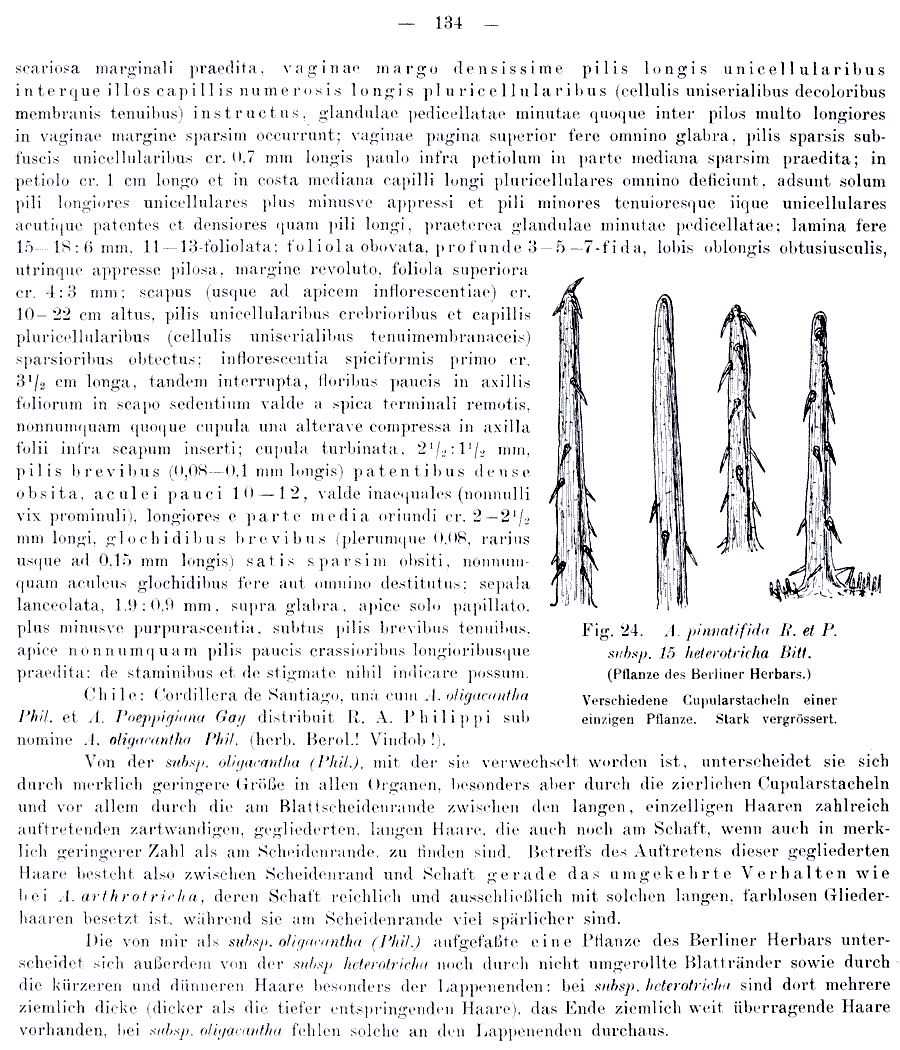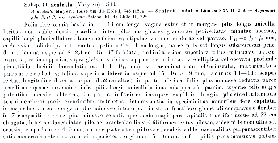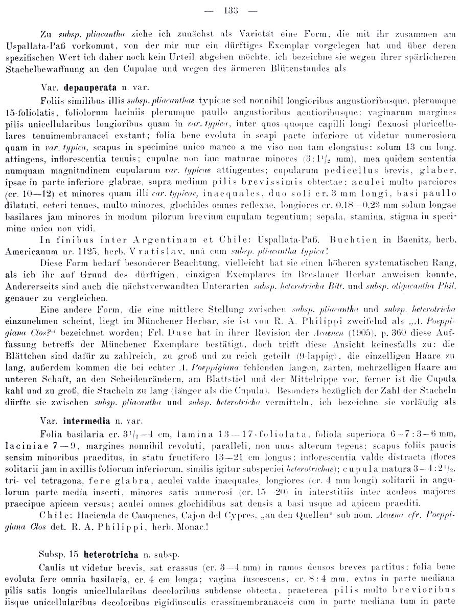 | Andriy Kovalchuk | Протолог Acaena pinnatifida ssp. pliacantha Bitter (Bibliotheca Botanica 17, Heft 74: 132. 1910), Acaena pinnatifida ssp. pliacantha var. depauperata Bitter, Acaena pinnatifida ssp. pliacantha var. intermedia Bitter и Acaena pinnatifida ssp. heterotricha Bitter (Bibliotheca Botanica 17, Heft 74: 133. 1910):
