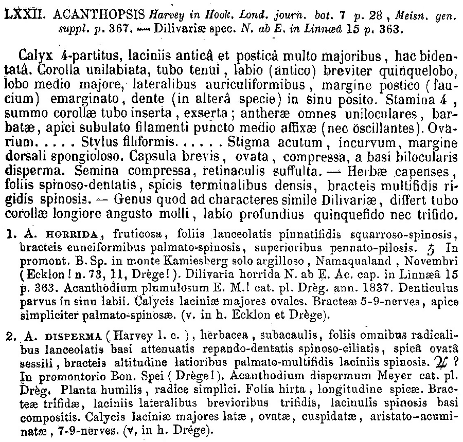 | Andriy Kovalchuk | Авторство комбинации Acanthopsis disperma приписывается W. H. Harvey, однако, как видно из приведённого в 1-м сообщении фрагмента, он указал данный вид как тип описанного им рода, но нигде не использовал название Acanthopsis disperma в явном виде. Согласно Steyn & van Wyk (2015), авторство данной комбинации следует указывать как Acanthopsis disperma Nees (см. 2-е сообщение в этой теме). |