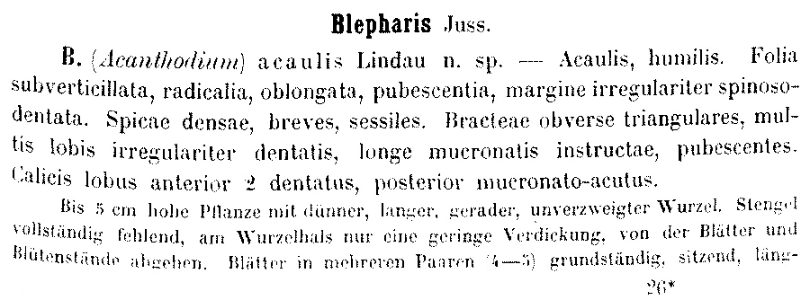 | Andriy Kovalchuk | Протолог Blepharis acaulis Lindau (Botanische Jahrbücher für Systematik, Pflanzengeschichte und Pflanzengeographie 49(3-4): 403. 1913 [28 Mar 1913]):