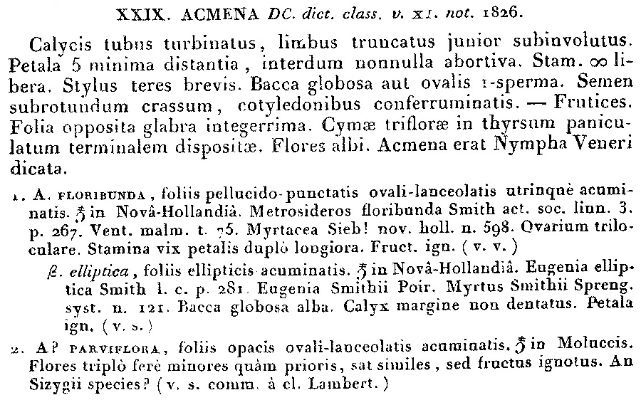 | Andriy Kovalchuk | Протолог рода Acmena DC. (Prodromus Systematis Naturalis Regni Vegetabilis 3: 262. 1828; лектотип: Acmena floribunda var. ellptica DC. ≡ Acmena smithii (Poir.) Merr. & L.M.Perry ≡ Syzygium smithii (Poir.) Nied.  :