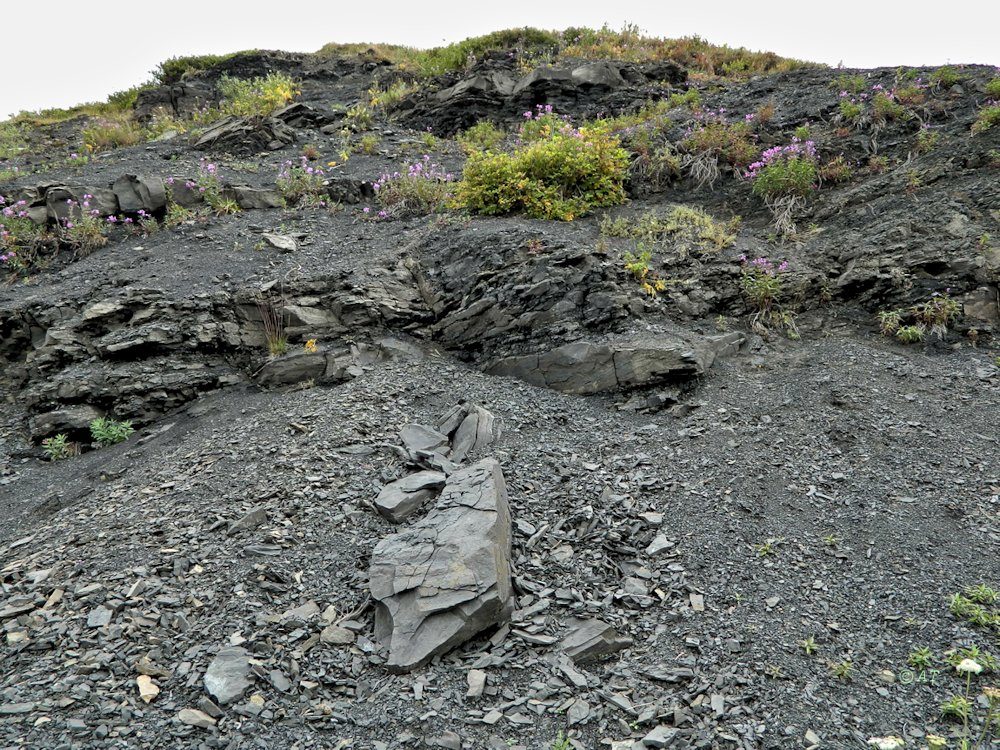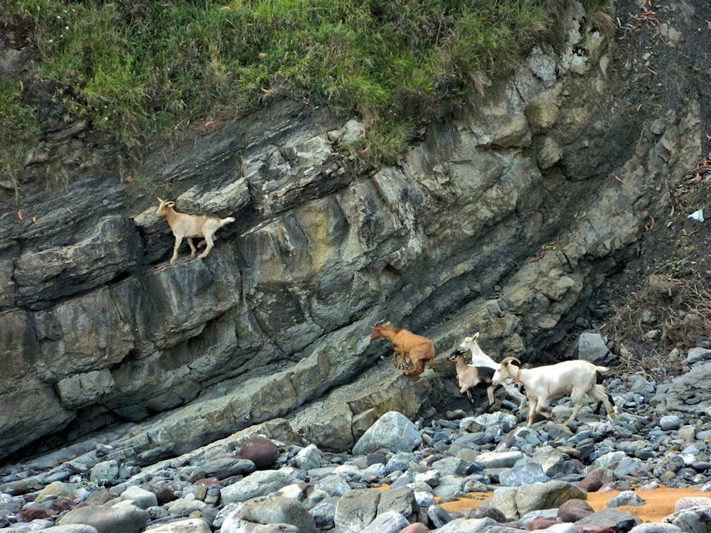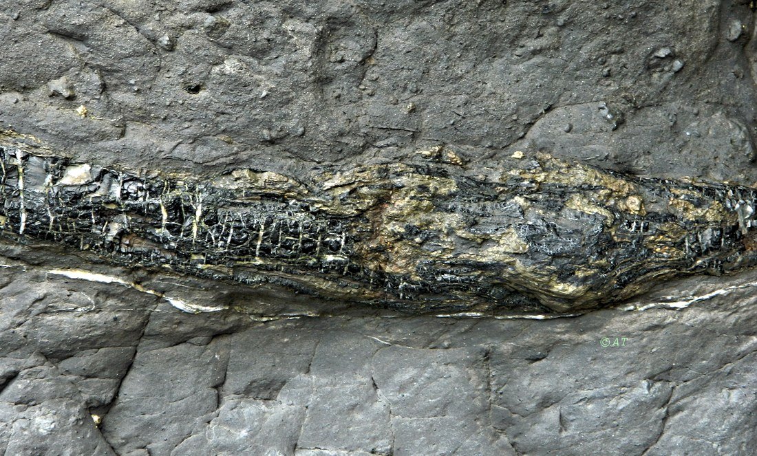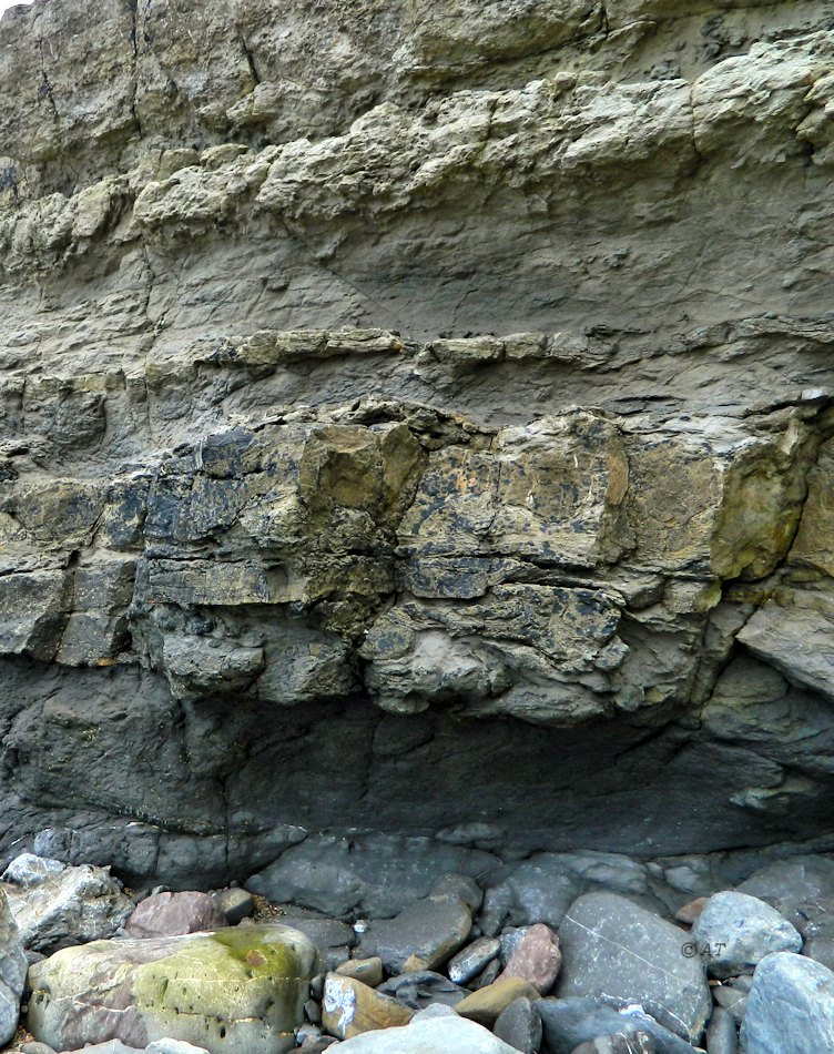 Здесь была мелкая прибрежная лагуна внутреннего моря 157 млн лет н., ходили динозавры (напр. зауроподы (Sauropoda  - это в верхнем слое складчатости. Окаменелость в нижнем слое, 4 м ниже.