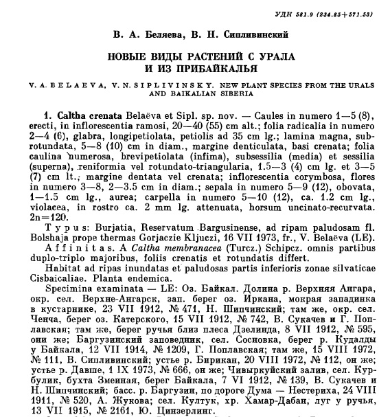 Протолог Беляева В.А., Сипливинский В.Н. Новые виды растений с Урала и из Прибайкалья / Ботанический журнал, 1975. Т. 60. №. 6. С. 819-820.