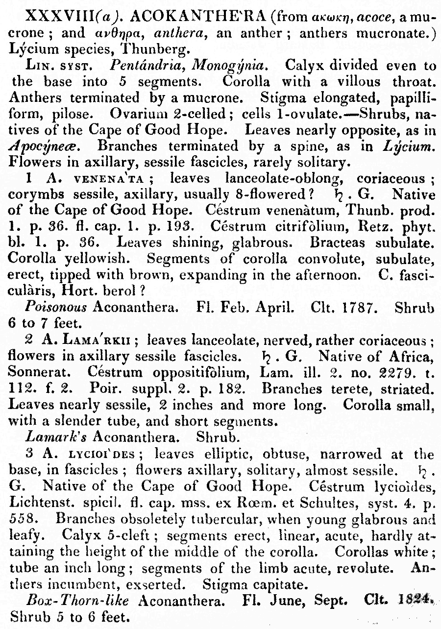 Протолог рода Acokanthera G. Don (A General History of the Dichlamydeous Plants 4: 485. 1837; лектотип: Acokanthera lamarkii G.Don, nom. illeg. (≡ Cestrum oppositifolium Lam. ≡ Acokanthera oppositifolia (Lam.) Codd, designated by Codd, Bothalia 7: 448 (1961Big smile image: