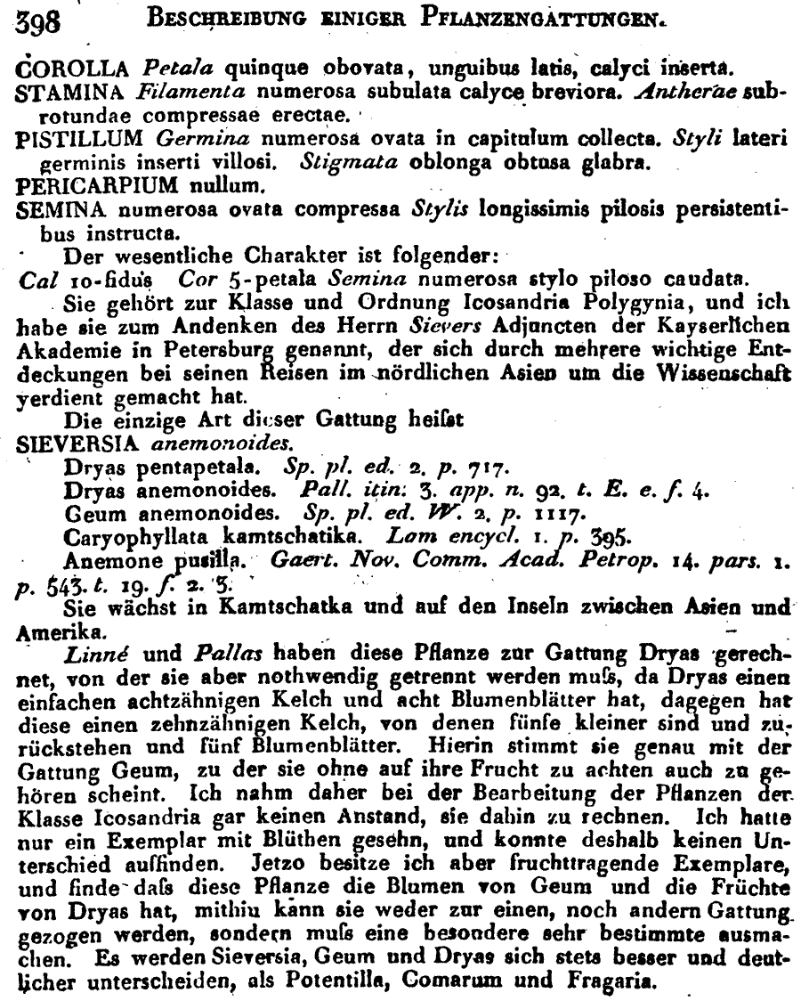 | Andriy Kovalchuk | Протолог рода Sieversia Willd. (Magazin für die Neuesten Entdeckungen in der Gesammten Naturkunde, Gesellschaft Naturforschender Freunde zu Berlin 5(4): 397–398. 1811 [Jul-Dec 1811]; тип: Sieversia anemonoides Willd., nom. illeg. (≡ Dryas pentapetala L. ≡ Sieversia pentapetala (L.) Greene  :