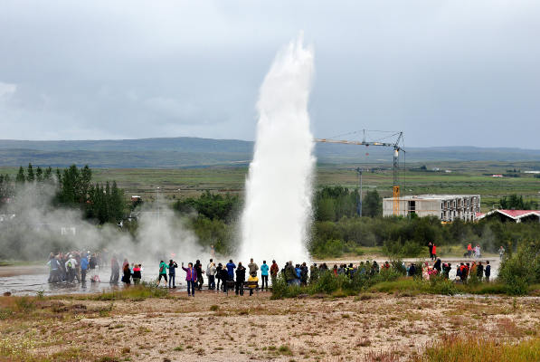 Здесь находится Большой Гейзер, который, правда, сейчас практически «не работает», если можно так выразиться. Его активность меняется после каждого крупного землетрясения, но в целом извержения сейчас происходят очень редко. Хотя говорят, что на национальный день Исландии туда бросают мыло, и Большой Гейзер отлично работает. Wink image Зато находящийся рядом гейзер Строккур исправно извергается на высоту около 20 м каждые 5-10 минут.