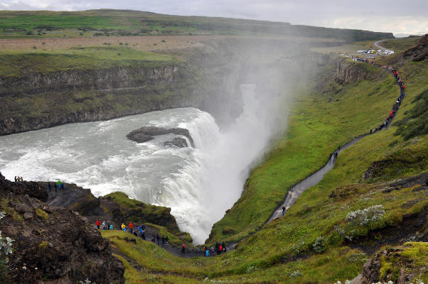 А совсем недалеко от долины гейзеров находится водопад Гюдльфосс, который тоже входит в «Золотое кольцо». Это огромный двухступенчатый каскад в ущелье реки Хвитау, который вполне мог исчезнуть, т.к. там несколько раз порывались построить ГЭС, но, к счастью, так и не построили, так что этот прекрасный водопад все еще существует. Smile image