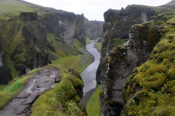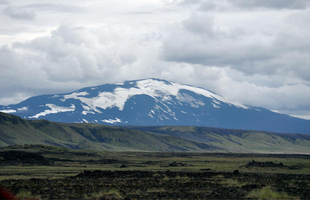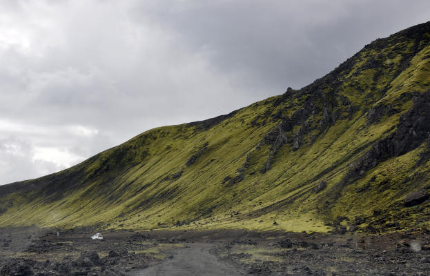 На другой день мы ездили в вулканическую местность Ландманналаугар. Дорога через лавовые поля, конечно, не самая простая, на обычной легковушке, наверное, кое-где и не проехать, особенно в дождливую погоду. Но в основном это вполне привычная для нас каменистая дорога типа «стиральная доска», т.е. ничего сверхъестественного. Зато красота необыкновенная! Сначала проезжаешь черные лавовые склоны, поросшие какими-то потрясающими нежно-зелеными мхами, а потом видишь заполненные водой старые кратеры…
