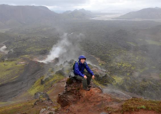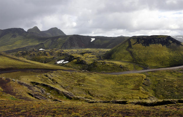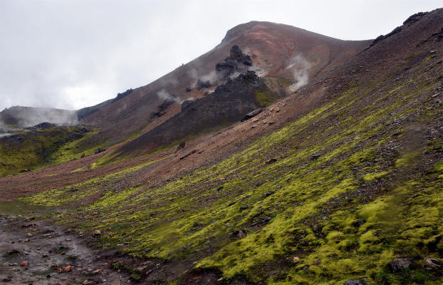 Дальше все склоны уже почти полностью покрыты мягким моховым ковром, а вдали уже видны разноцветные риолитовые горы…