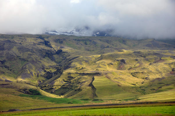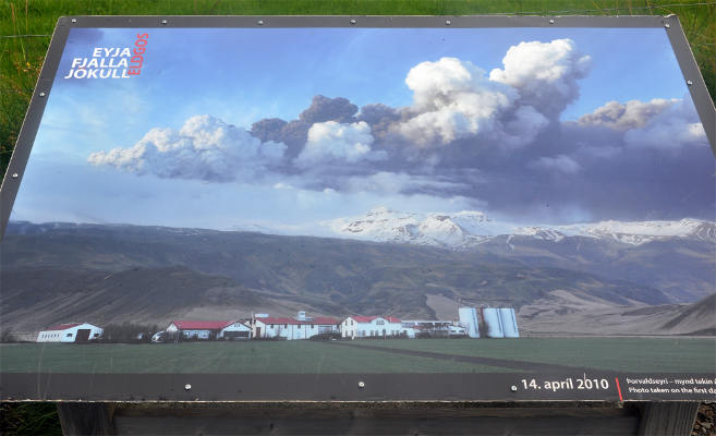 Кстати, там совсем неподалеку находится тот самый вулкан с непроизносимым названием, который извергался в 2010 году. Сам он был практически полностью скрыт облаками, так что его «портрет» нам удалось увидеть только на памятной табличке: