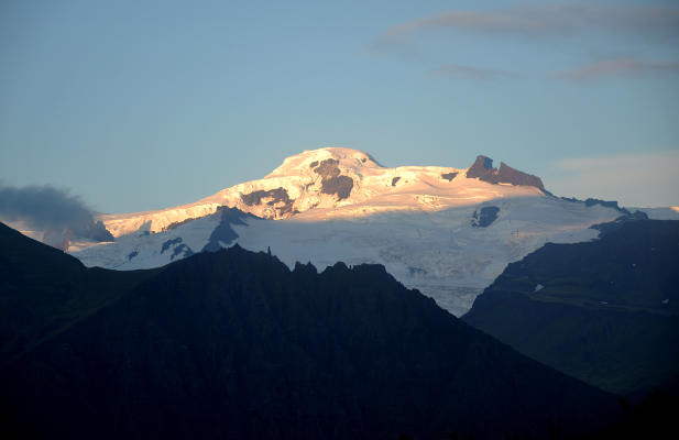 А к вечеру мы увидели, пока только издали, ледники национального парка Ватнайокюдль. Там неподалеку от кемпинга, конечно, тоже есть водопад, он называется Свартифосс.