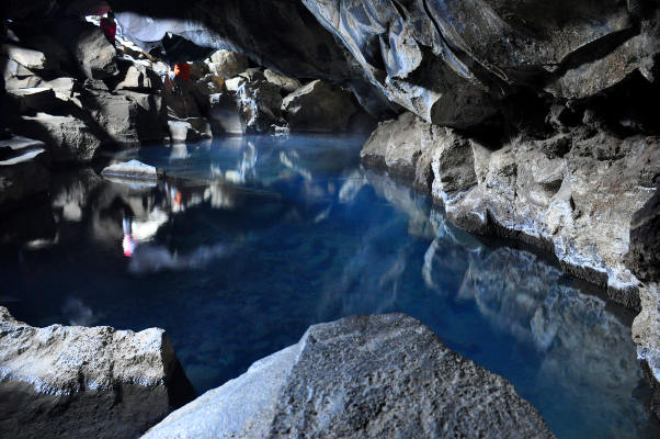 Лавовые поля недалеко от озера Миватн изобилуют глубокими трещинами, а в лавовую пещеру с термальным источником и небольшим озерцом даже можно спуститься. Она называется Грётегья, и до 1970х годов там купались туристы, но потом после извержения вулкана Крафла пещеру частично завалило, к тому же там поднялась температура воды, так что даже просто слазать туда можно только «на свой страх и риск», как написано у входа.
