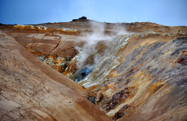 Оттуда видна геотермальная электростанция, придающая суровому пейзажу индустриальную нотку: