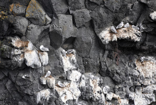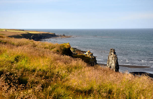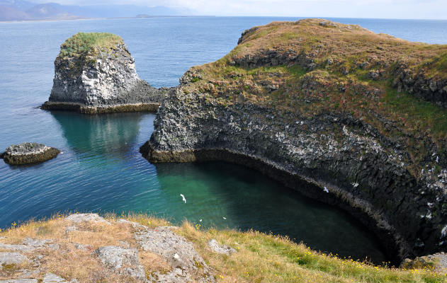 Побережье здесь очень разнообразно. Например, на юго-востоке в заливе Брейдавик есть вот такое суровые отвесные скалы, на которых очень много птиц:
